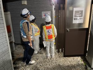 - 地域の防犯のために事務所の入口を凄く明るくしているなど、昼間の工事では見られない工夫や対策もたくさん確認できました。